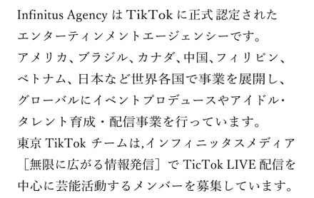 | 募集概要 | 東京TikTokチームでは、インフィニッタス メディアでTicTok LIVE配信するメンバーを募集 |