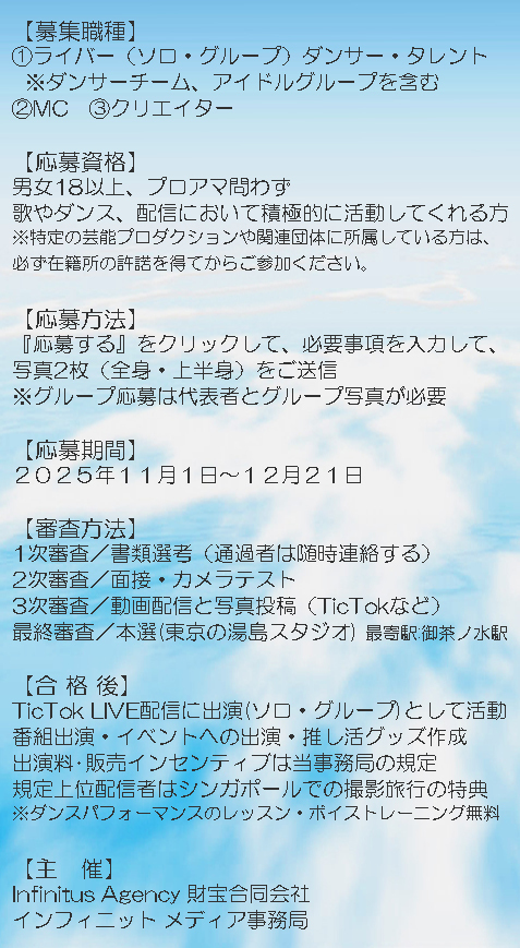 この度、東京TikTokチームでは、インフィニット メディアでTicTok LIVE配信に歌・ダンスで活動してくれる方を募集します。